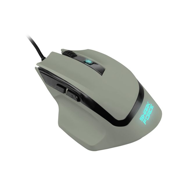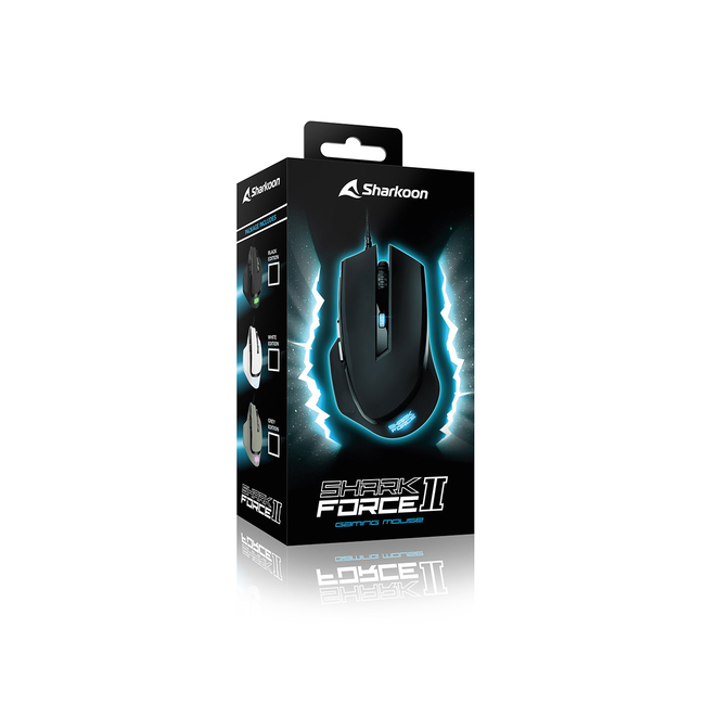 Sharkoon SHARK Force II. Fattore di forma: Mano destra. Tecnologia di rilevamento del movimento: Ottico, Interfaccia dispositivo: USB tipo A, Risoluzione movimento: 4200 DPI, Tipo di pulsanti: Tasti premuti, Numero di tasti: 6, Tipo di scorimmento: Rotella, Accelerazione (max): 10 G. Alimentazione: Cavo. Colore del prodotto: Grigio