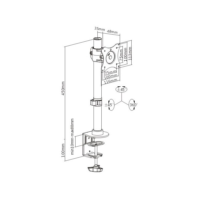 Link Accessori LKBR05. Montaggio: Morsa, Adatto per: Monitor per computer, Peso massimo (capacità): 10 kg, Capienza minima dimensioni dello schermo: 33 cm (13"), Capienza massima dimensioni dello schermo: 68,6 cm (27"), Compatibilità interfaccia di montaggio (min): 75 x 75 mm, Compatibilità interfaccia di montaggio (max): 200 x 200 mm. Regolazione altezza, Angolo di rotazione: -45 - 45°, Inclinazione: -45 - 45°. Colore del prodotto: Nero