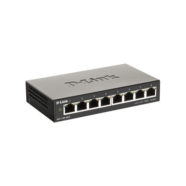 D-Link DGS-1100-08V2. Tipo di porte RJ-45: Gigabit Ethernet (10/100/1000), Quantità di porte RJ-45: 8. Capacità di commutazione: 16 Gbit/s. Voltaggio input DC: 5 V